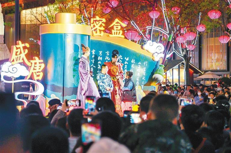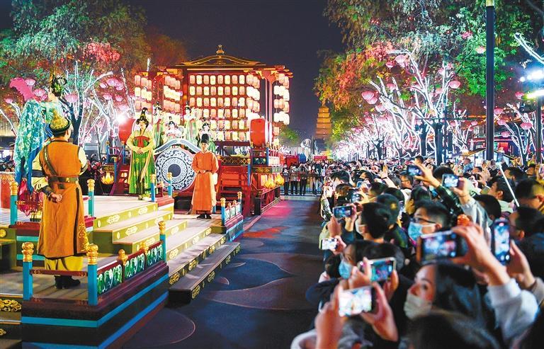 文化為旅游賦能,旅游因文化而有了靈魂。如果說(shuō)大唐不夜城是西安盛唐文化的名片,那么大唐不夜城的演出則把盛唐文化真切地呈現(xiàn)在了人們的面前。《霓裳羽衣舞》是盛唐最華麗的舞蹈,《花車(chē)斗彩》展示了大唐風(fēng)采,《盛唐密盒》把生活過(guò)成了段子,《華燈太白》凝結(jié)了李白的詩(shī)情與不羈,“不倒翁小姐姐”巧笑倩兮,搖出了長(zhǎng)安女子的溫柔……