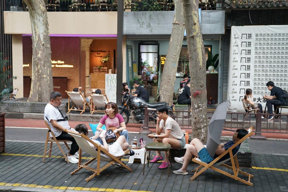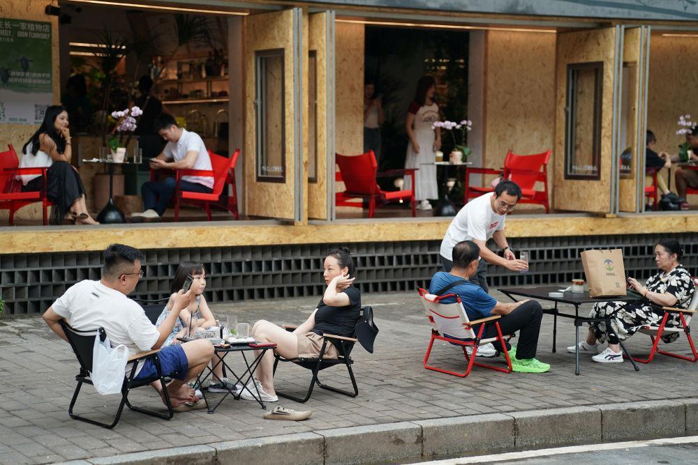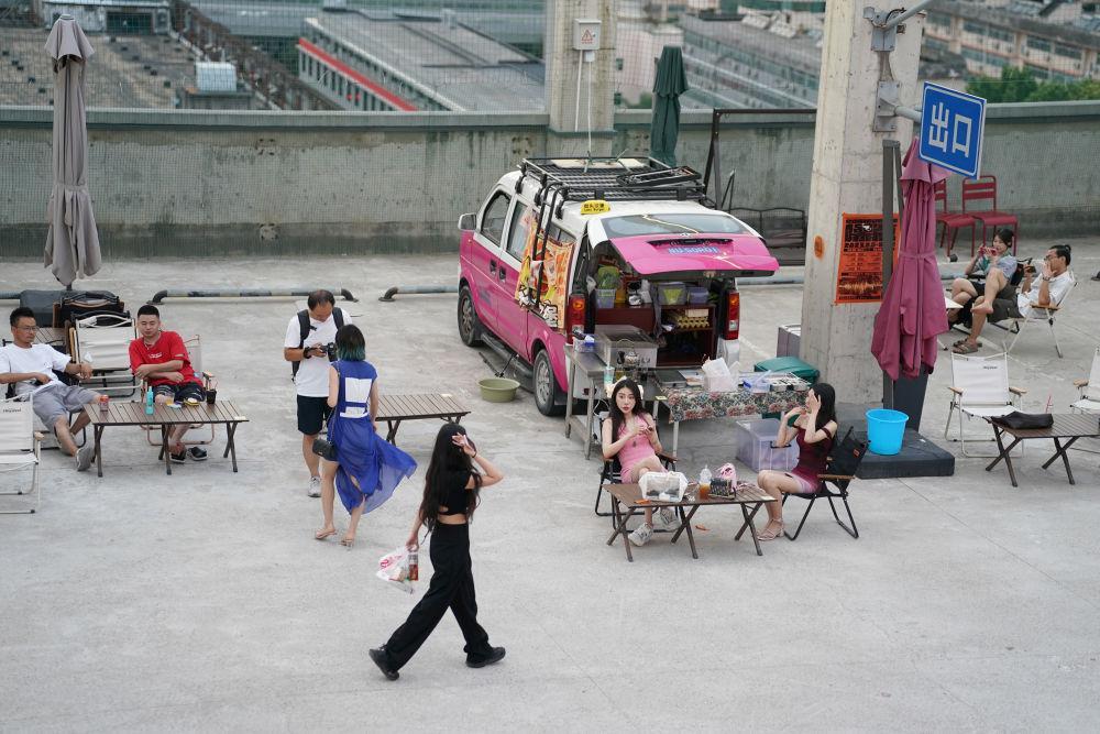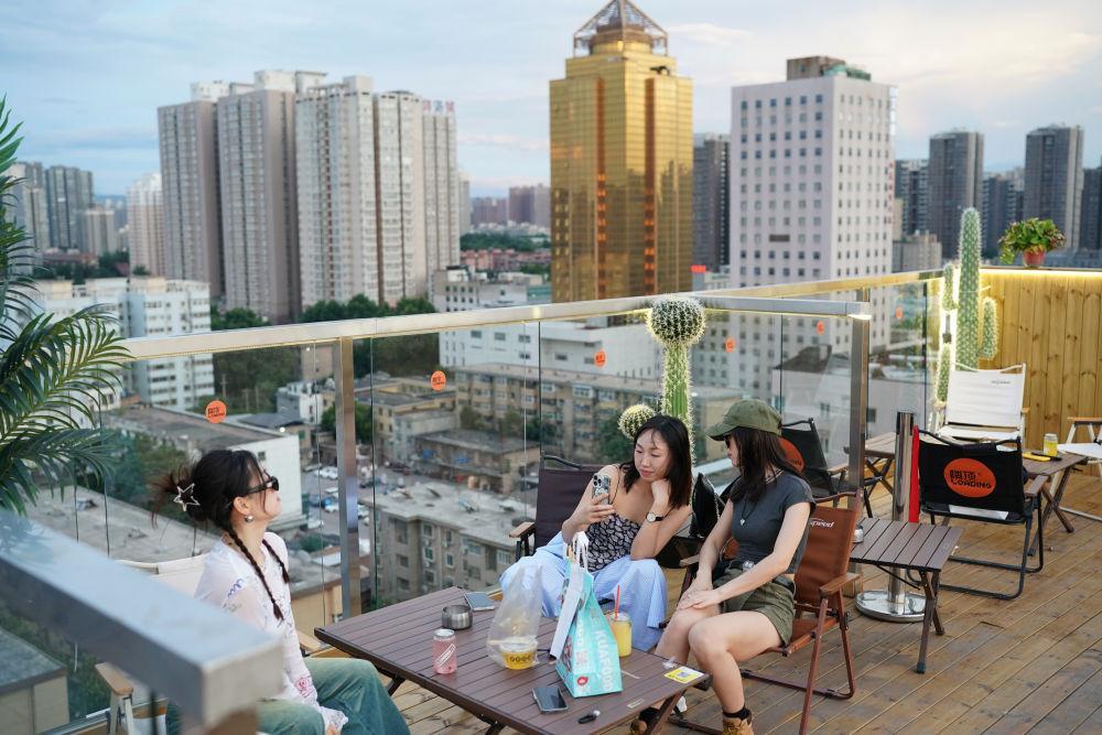 7月26日,年輕人在一棟由停車樓頂層改造而來的飲品店內(nèi)消費(fèi)休閑。新華社記者 邵瑞 攝