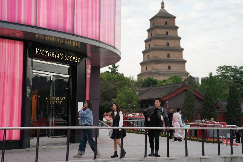 游客在西安大雁塔邊一家商業(yè)綜合體附近游玩(5月8日攝)。