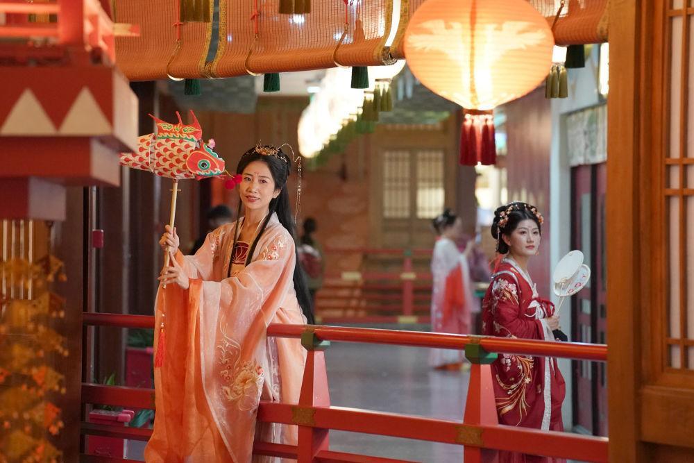 5月11日,游客在西安“長安十二時(shí)辰”主題街區(qū)內(nèi)拍照游玩。新華社記者 邵瑞 攝