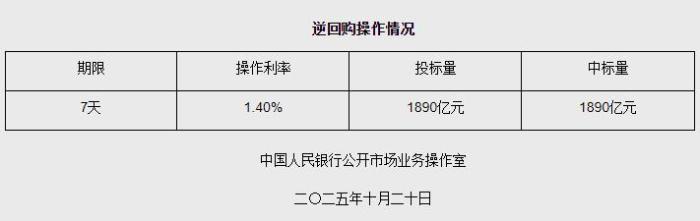 據(jù)央行網(wǎng)站消息,2025年10月20日中國人民銀行以固定利率、數(shù)量招標(biāo)方式開展了1890億元7天期逆回購操作。具體情況如下: