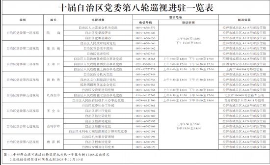 據(jù)悉,各巡視組將在被巡視單位工作50天左右,期間設(shè)專門值班電話和郵政信箱,開通信訪意見箱等信訪渠道,主要受理反映被巡視黨組織領(lǐng)導(dǎo)班子及其成員、下一級黨組織主要負責(zé)人和重要崗位領(lǐng)導(dǎo)干部問題的來信來電來訪,重點是關(guān)于違反政治紀律、組織紀律、廉潔紀律、群眾紀律、工作紀律、生活紀律等方面的舉報和反映。巡視組受理信訪時間截止到2025年12月10日。(趙文慧 土旦仁青)