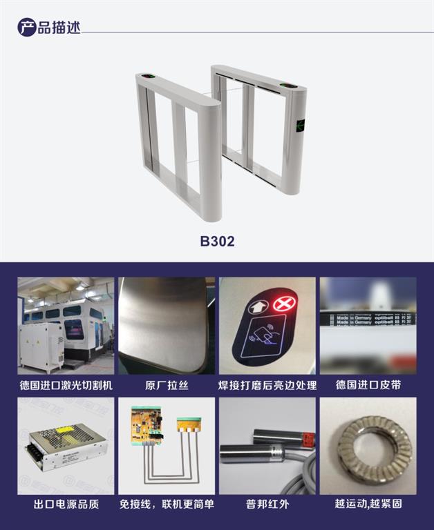機(jī)場(chǎng)_速通門B302功能特點(diǎn): 1. 進(jìn)口304不銹鋼; 2. 箱體激光切割加工; 3. 精焊,精磨工藝; 4. 表面原廠拉絲; 5. 紅外防夾保護(hù); 6. 非法闖入紅外報(bào)警; 7. 刷卡開閘反向逆行報(bào)警; 8. 凈重:?jiǎn)螜C(jī)芯:45kg, 雙機(jī)芯:85kg;