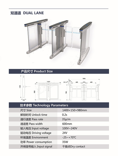 1.速通門B323A系統(tǒng)具備防撞功能,當(dāng)有外物在未授權(quán)的狀態(tài)下撞擊擺桿,擺桿運(yùn)動(dòng)角度達(dá)到菜單設(shè)定的值(如 2°),控制器_會啟動(dòng)剎車機(jī)構(gòu),阻止擺桿運(yùn)動(dòng),并啟動(dòng)聲光報(bào)警。當(dāng)外力進(jìn)一步增大,剎車控制器會保護(hù)擺桿不被撞斷,外力撤除后,擺桿自動(dòng)歸位,系統(tǒng)正常; 2.速通門B323A系統(tǒng)具備角度分辨和零位自檢功能,包含 500P/R 編碼器,分辨精度高,這種高精度的傳感器的優(yōu)勢是使擺桿轉(zhuǎn)動(dòng)_; 3.非法進(jìn)入有報(bào)警提示功能; 4.防沖功能,在沒有接收功能開閘信號,擺臂自動(dòng)鎖死; 5.紅外防夾功能,在擺臂復(fù)位的過程中紅外檢測到人在通道中,擺臂會自動(dòng)回到打開狀態(tài); 6.速通門B323A統(tǒng)一標(biāo)準(zhǔn)的對外電氣接口,可與多種讀卡器相掛接,并可通過管理計(jì)算機(jī)實(shí)現(xiàn)遠(yuǎn)程控制與管理; 7.系統(tǒng)設(shè)有過流保護(hù)裝置,當(dāng)負(fù)載_過某設(shè)定值(如 2._),系統(tǒng)停止工作,以免燒壞電機(jī)等設(shè)備;